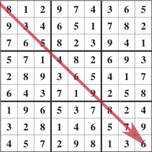 Vyriešte sudoku a napíšte poradie čísel zasebou od ľavého horného rohu diagonálne do pravého spodného roku. Za každe sudoku 10b